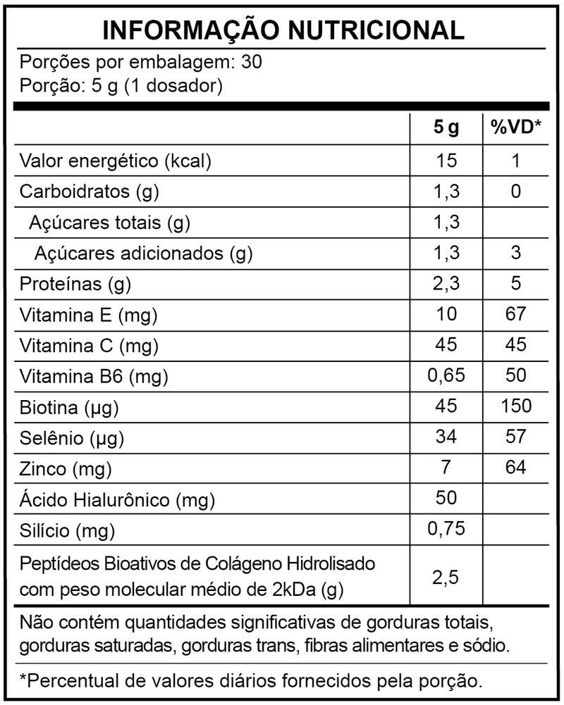 Com colágeno hidrolisado Verisol® associado ao famoso ácido hialurônico e silício orgânico, contém ainda biotina, vitaminas antioxidantes, zinco e selênio que contribuem para a manutenção da sua pele, cabelo e unhas. E tudo isso com um delicioso sabor de laranja com acerola feito com polpa de fruta!