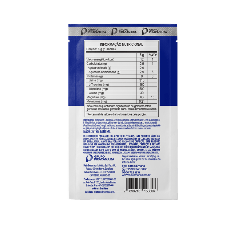 Isomaltulose, L-Triptofano, Camomila (Matricaria recutita L.) em pó, L-Lisina, L-Treonina, Cravo da Índia (Caryophyllus aromaticus L.) em pó, L-Glicina, Maracujpa (Passiflora alata Dryaná) em Pó, Melatonina, Acidulante Ácido Cítrico, Aromatizantes, Antiumectante Dióxido de Silício, Edulcorante Glicosídeo de Steviol, Corante Curcumina, Emulsificante Goma Xantana.