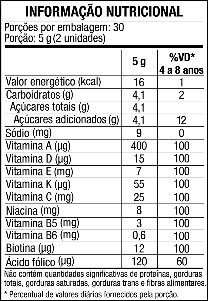criança. Em formato de goma sabor morango, possui em sua composição vitamina A, C, D, nia cina, vitaminas B5 e B6, vitamina E, ácido fólico, vitamina K e biotina.