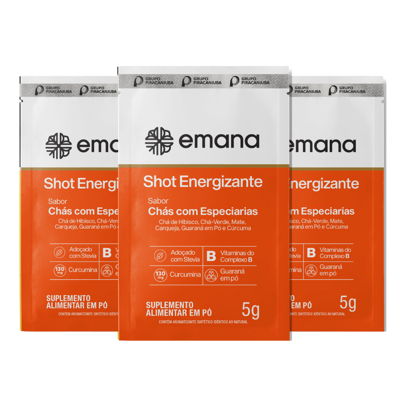 O Shot Energizante conta com um blend exclusivo com extrato de cúrcuma, guaraná em pó e 4 tipos de chás (hibisco, carqueja, mate e chá verde), contribuindo para um dia mais ativo.